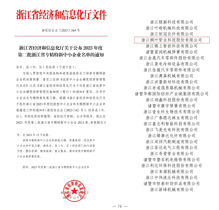 浙江尊龙凯时管业科技股份有限公司荣获 2023年度浙江省专精特新中小企业称号 |