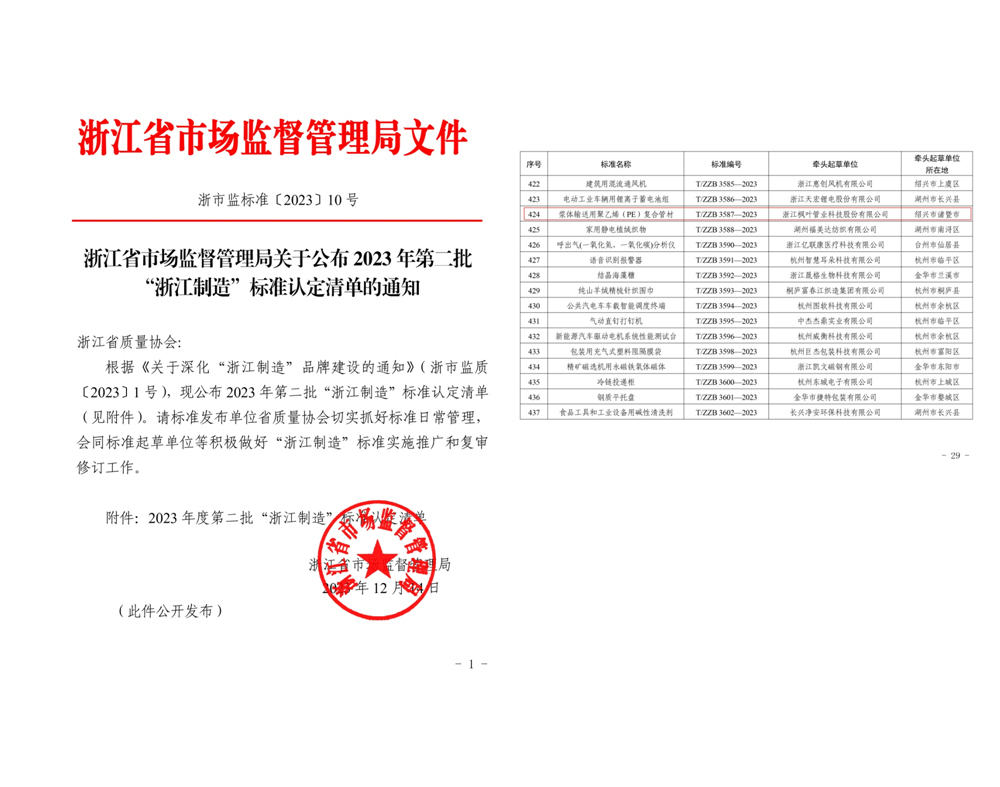 近日,浙江省市场监督管理局公布了2023年“浙江制造”标准认定名单,浙江尊龙凯时管业科技股份有限公司制定的《浆体输送用聚乙烯(PE)复合管材》(T/ZZB 3587-2023)标准被认定为2023年第二批“浙江制造”标准。这是尊龙凯时股份自2021年制定修复管“浙江制造”标准通过评审发布后,又一次突破。 “浙江制造”以区域品牌、先进标准、市场认证国际认同为核心,以“标准+认证”为手段,集质量、技术、服务、信誉于一体,是代表浙江制造业先进性的区域品牌形象标识,是浙江制造业的“标杆”和“领导者”,是高品质高水平的代名词。“浙江制造”标准定位为对标国际国内一流,体现制造业发展创新水平、符合引领产业高质量发展需求、具有高质量高效益内涵特征的先进团体标准。其标准范围包括制造业领域的产品标准、工艺标准、方法标准等。 目前,市场上大量使用钢管作为浆体输送管道,与公司生产的浆体输送用聚乙烯(PE)复合管材相比,环境适应性差、铺设方式单一、耐磨性能差、使用寿命短,不易搬运、维护成本很高。而此款产品利用前沿技术、复合工艺,使其具有耐腐蚀、抗磨损和抗紫外线等特点,即可埋地也可露天敷设,有较长的使用寿命,大大降低了维护成本。 此次获认可发布的《浆体输送用聚乙烯(PE)复合管材》(T/ZZB 3587-2023)相较于现有标准,关键技术指标进行了显著优化和提升,不仅补充和完善了现有的标准体系,也进一步规范了市场秩序,提高了产品的整体质量。这一标准的实施,也有利于提升“浙江制造”的品牌形象,推动公司的可持续发展进程。 在企业发展的道路上,尊龙凯时公司始终坚信标准化的重要性,并一直致力于推进行业标准化进程。未来,我们将继续加大对新产品、新技术的研发力度,积极创新,持续进步,为消费者提供更优质的产品和服务。 |
